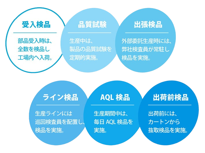 外注品の受入検品や各工程間での検品を実施し、半製品の段階から厳しいチェックを行っております。また、クリーンルーム内での検品・梱包に加え、梱包後製品のAQL(抜取検査)も実施しております。